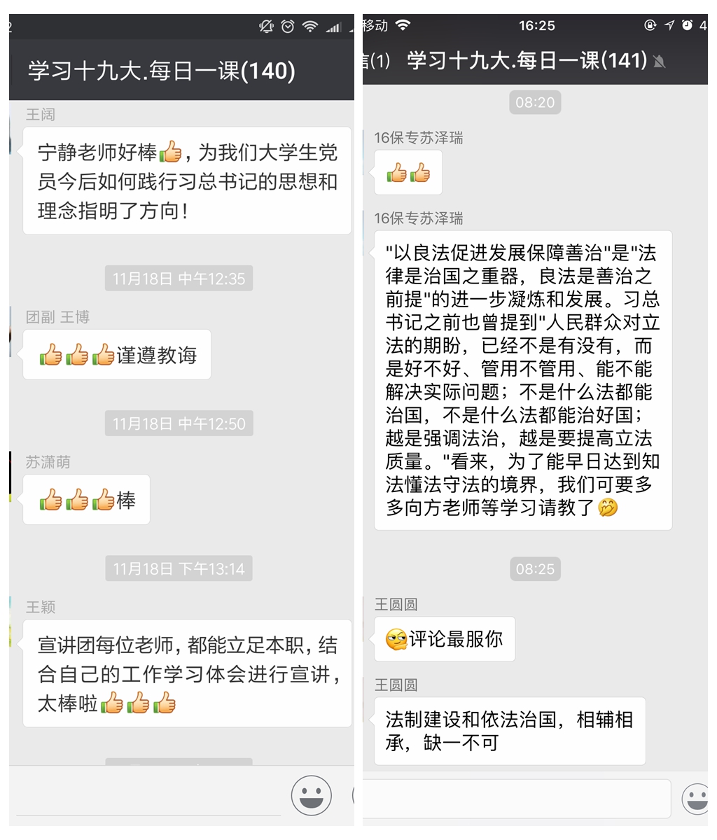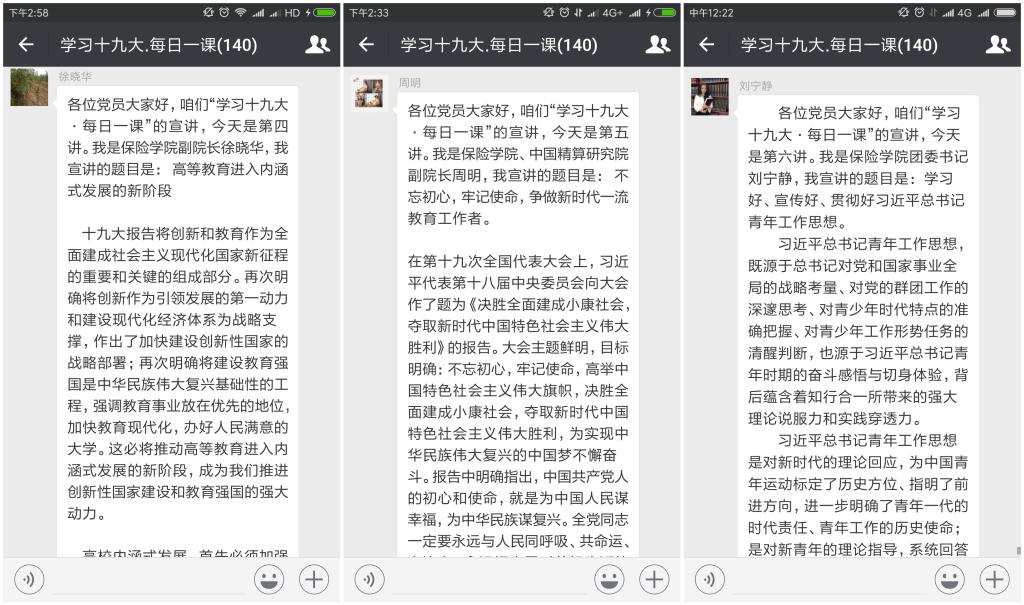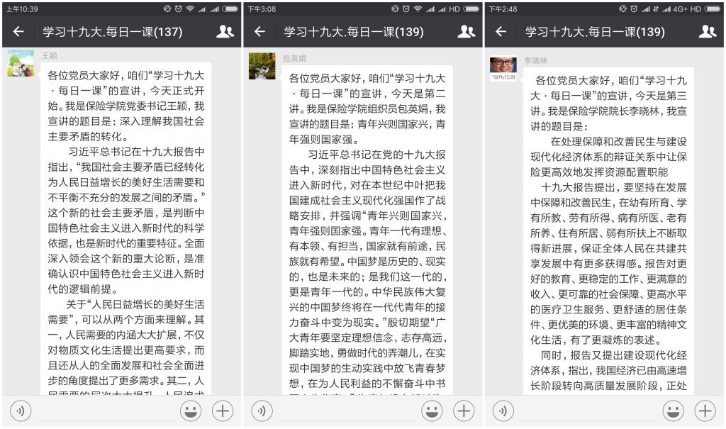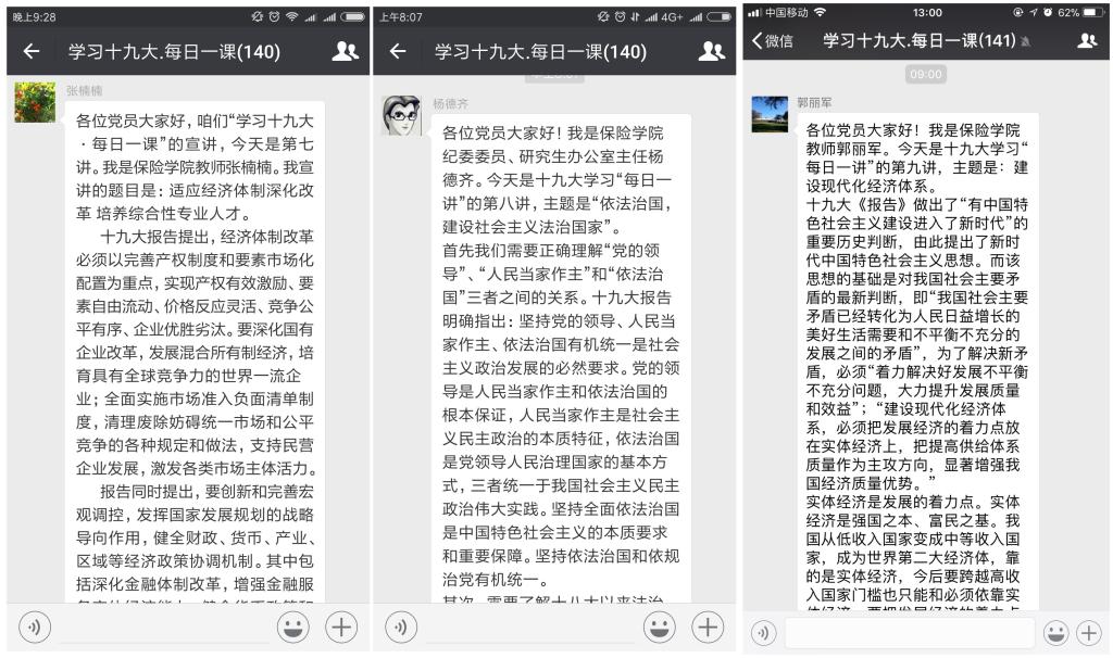 为此,77779193永利党委建立了“学习党的十九大·每日一课”党员微信群,成立“党的十九大精神宣讲团”。宣讲团团长为学院党委书记,成员为学院党委委员、纪委委员、各党支部书记以及学院老党员。宣讲团成员按顺序每日发布有关党的十九大精神的学习内容和体会。