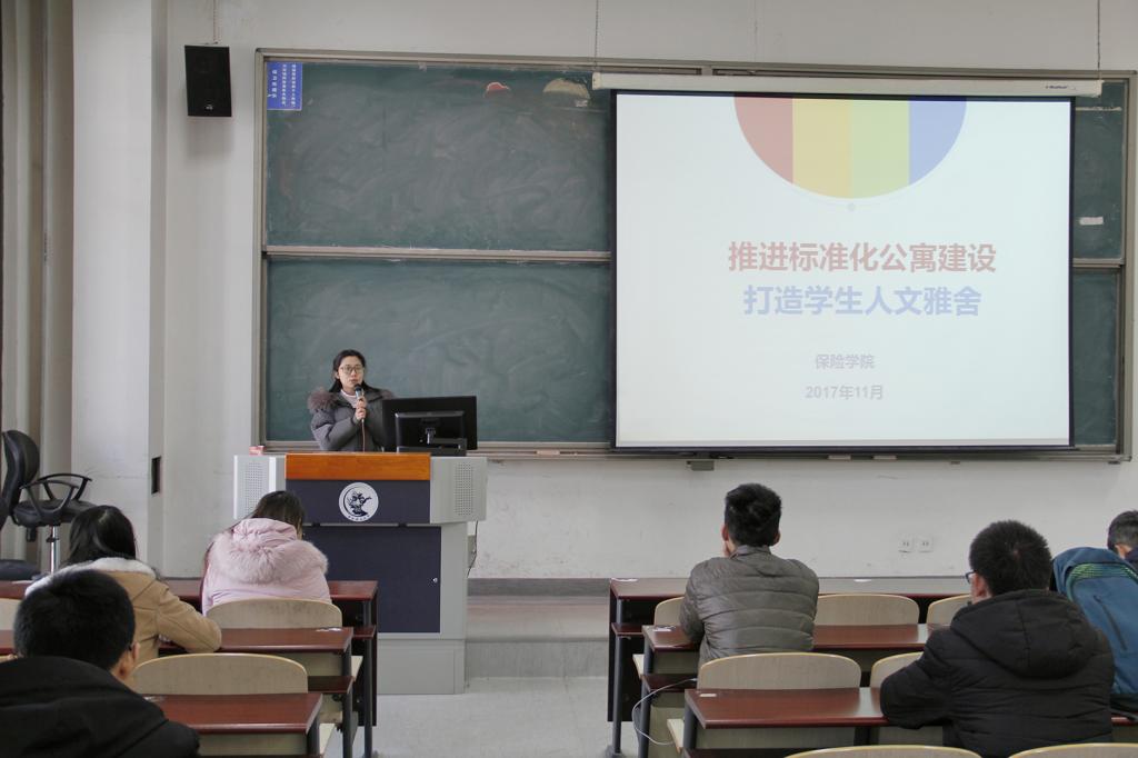 培训会伊始,才立琴老师向全体学生强调了宿舍建设的重要性,指出打造人文雅舍的意义与影响。随后由袁嘉琳老师为大家讲述了有关标准化公寓建设的条例,配合着生动形象的宿舍实景,从八个不同的方面提出了宿舍检查的要求,同时强调了宿舍纪律问题。接着,她举例说明了宿舍内存在的火灾问题,并介绍了“如何预防火灾之校园五不该”,提醒学生防患于未然。
