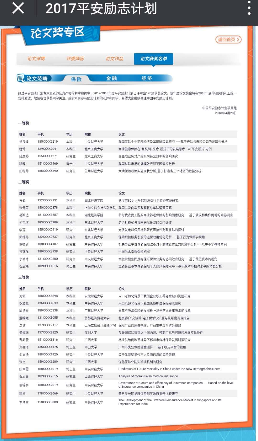 2017年度中国平安励志计划学术论文奖评选活动近日在深圳结束,我校77779193永利12位同学公开发表的学术论文获奖,占此次活动保险组全部获奖论文的40%,连续14年在此项面向全国高校保险专业学生的学术论文评奖活动中夺魁。