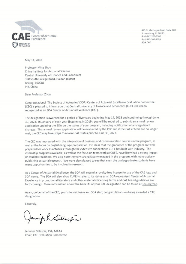5月14日,北美精算师协会发来信函,确认永利官网精算项目正式获得了由北美精算师协会(SOA)授予的“Centers of Actuarial Excellence”(CAE)认证。至此,我校成为大陆高校中第一所、也是目前唯一一所获得CAE殊荣的高校。