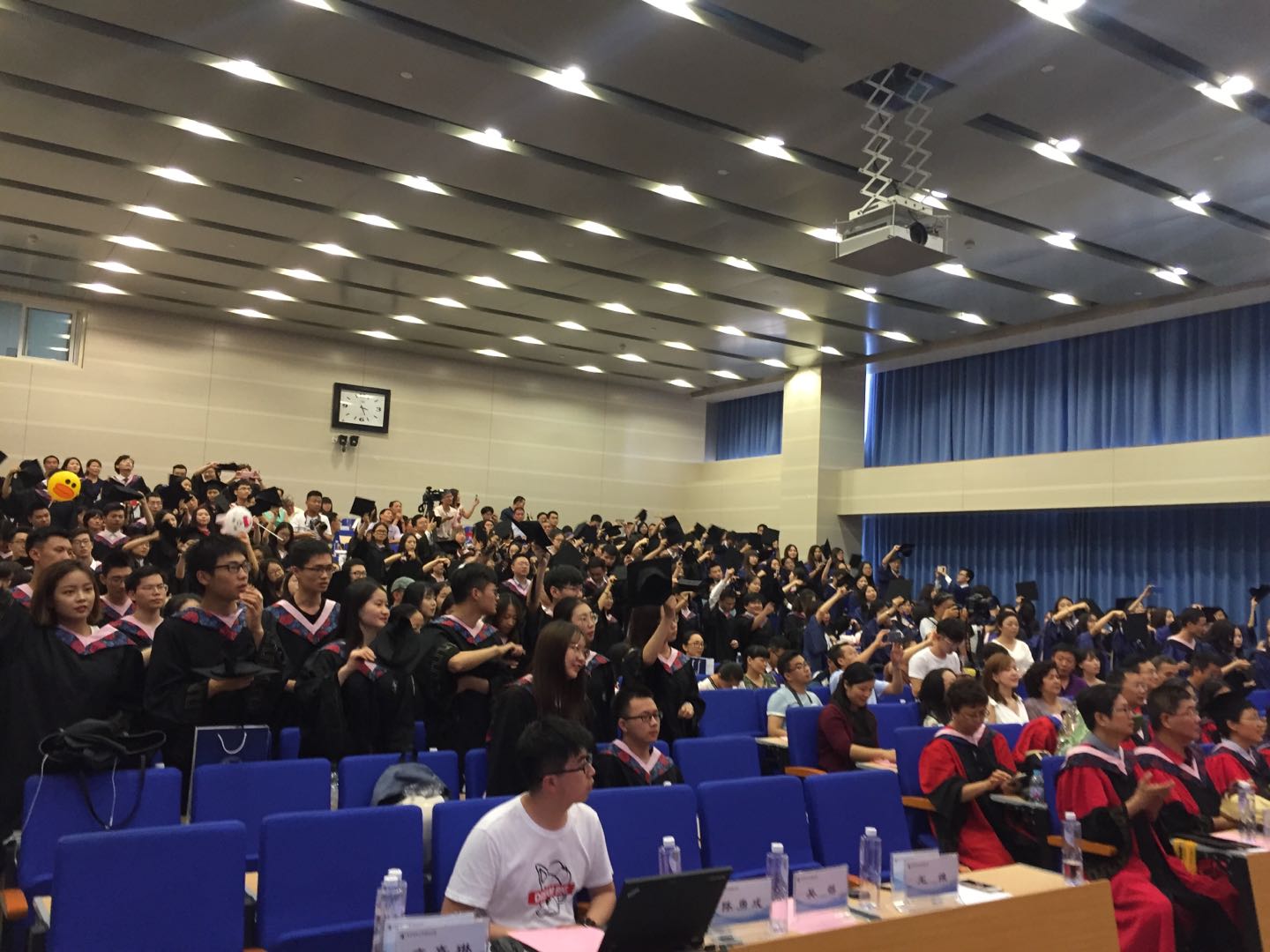 毕业生代表和研究生代表为全体毕业生带来了《你好,再见》和《仰望星空》,动听的歌声,悠扬的旋律,全体毕业生挥舞双手全场合唱,将典礼推向了高潮。