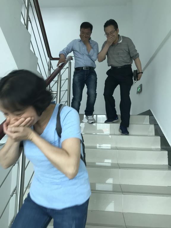 在讲座结束后,谢老师组织全体教师开展了逃生演习,模拟办公室发生严重火情,老师们在最短的时间从消防通道安全、有序撤离火情现场,整个过程紧张迅速,实用性强,提升了老师们应对火灾现场逃生的技巧。
