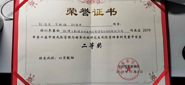 研究生风险管理方案设计竞赛中,韦晓老师指导的罗雅允、姚盛杰和王高楠三位研究生的作品《“宏观调控+保险+期货”生猪价格大幅波动风险管理》获得了中国精算师协会颁发的一等奖,郑苏晋老师指导的郭海若、宋姝凝和胡海涛三位研究生的作品《微博大数据分析在风险管理的不同阶段的作用》获得了中国精算师协会颁发的二等奖。