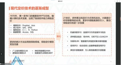 侯岳女士还介绍了最近几年精算定价领域的新技术与新发展,让学生们了解非寿险精算实务前沿,为他们未来的工作提供一些新的启发。最后,侯岳女士结合实例向同学们介绍近几些年热门的机器学习技术在传统精算定价领域的应用,帮助学生们更好地学习与理解非寿险精算知识。