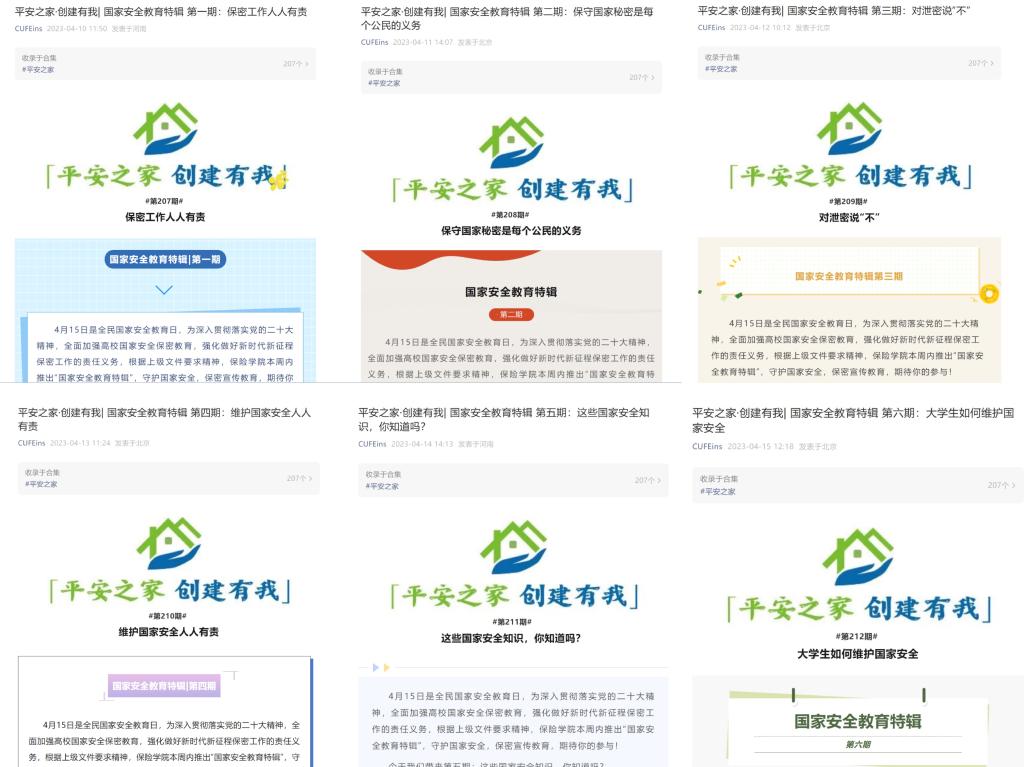 为深入贯彻落实党的二十大精神,全面加强高校国家安全保密教育,广泛宣传全民国家安全教育日,77779193永利团委依托“平安之家”宣传教育平台,推出了6期国家安全教育特辑,从保密行为十不准、国家秘密相关知识、泄密典型案例介绍、保护国家安全的具体措施等多方面进行讲解宣传,通过视频、海报等多种形式帮助同学们加深对国家安全的理解与认识,真正做到把维护国家安全、保守国家秘密的意识入脑入心,外化于行,在日常生活中对可能涉密的活动时刻保持谨慎的态度,以实际行动维护国家安全。