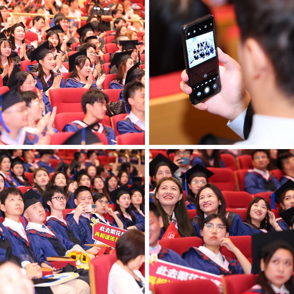 典礼上首先播放了由2022届、2023届毕业生准备的毕业视频。龙马路上的欢声笑语、骋望楼里的废寝忘食、研讨室内的激烈讨论......视频带领大家回忆在中财大的美好时光与点滴记录。此外,学院老师们的谆谆教诲也将时刻提醒同学们不忘专业使命,牢记民生福祉,为国家、为人民做出更大贡献。
