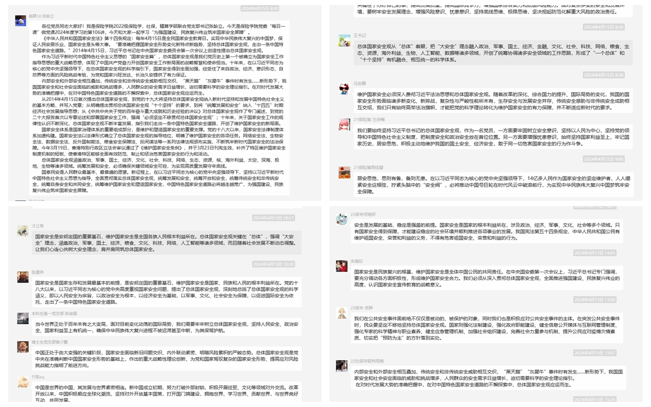 学院组织学生通过线上参观“总体国家安全观十周年主题展”、自主或集体观看“千万高校学生同上一堂国家安全教育课”主题公开课、参加全国大学生国家安全知识答题活动等多种渠道参与全国国家安全教育日相关活动,全方位学习总体国家安全观相关内容。丰富多样的活动形式,生动翔实的学习内容,激发了同学们参加本次系列活动的兴趣与热情。同学们纷纷表示,通过参与各种学习教育活动,我们深刻认识到了国家安全、法治建设、反邪教反恐等教育的重要性。作为新时代青年大学生,我们应该认真学习国家法律法规,增强法律意识,时刻维护国家安全和个人安全,主动担负起国家安全的守护者和维护者的责任和义务,为保卫国家的安全稳定和可持续发展贡献自己的智慧和力量。