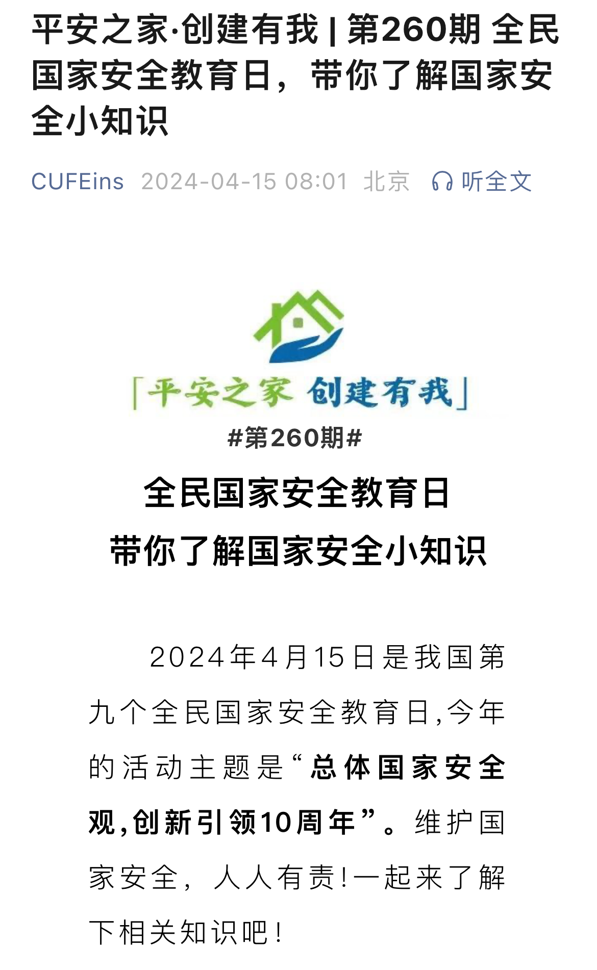 为了培养青年学子敏锐的风险洞察力与自觉的责任担当,引导学生深刻理解国家安全的内涵,77779193永利团委依托“平安之家”宣传教育平台于4月15日推出国家安全教育日专题推送,向学生科普国家安全知识,引导学生树立总体国家安全观,以实际行动维护国家安全。