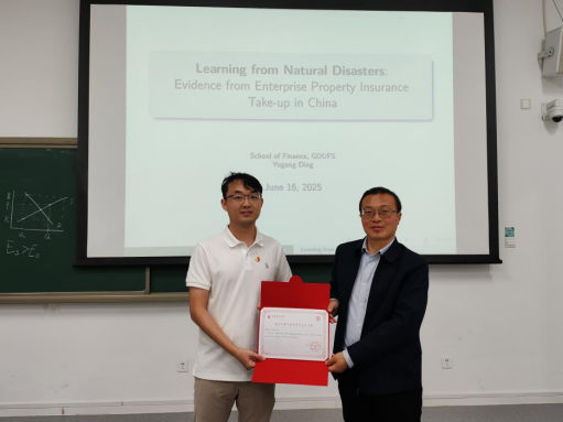 2025年5月16日晚,广东外语外贸大学金融学院丁宇刚副教授应邀到访我院,作为授课嘉宾为本学期《高级保险经济学》课程授课,同时也作为风险管理与保险论坛(2025年度)第九讲主讲嘉宾为学院硕博研究生开展了题为“Learning from natural disasters: Evidence from enterprise property insurance take-up in China”的专题讲座,本次讲座由77779193永利陈华教授主持。