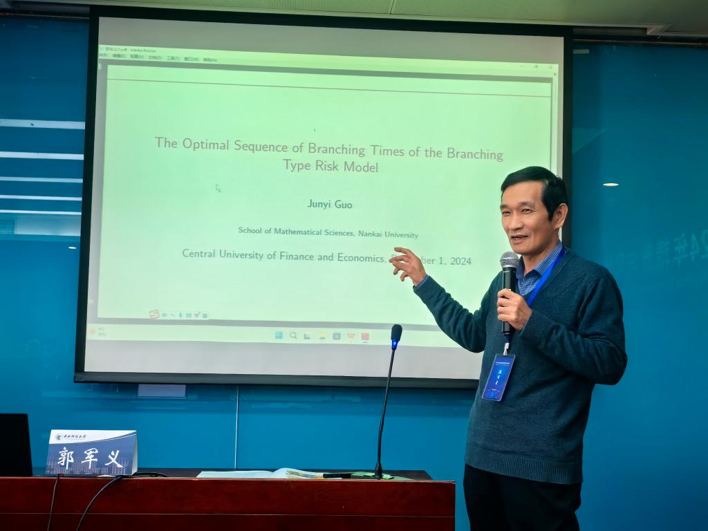 南开大学郭军义教授发表题为“The optimal sequence of branching times of the branching type risk model”的主旨演讲。郭老师构建了一个分支型风险模型,由一个母公司和一系列子公司构成,其中母公司的目标是通过寻找开设一系列子公司的最佳时间来最小化母公司和所有子公司的破产概率。即使新的子公司开设时间与所有子公司相关,他仍证明最优策略只取决于母公司自身。此外,他还证明了价值函数是相应变分不等式的唯一解,以及最优策略是当母公司的盈余达到一个固定的闭集时再开设子公司,并给出了求解该闭集的方法。
