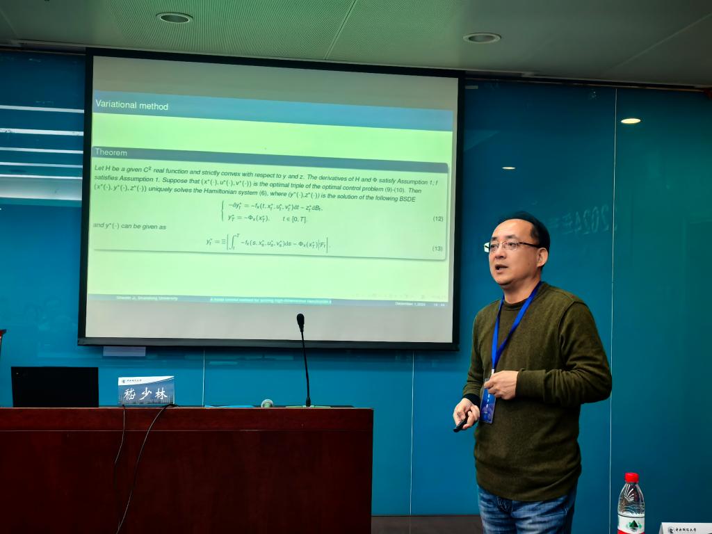 山东大学嵇少林教授发表题为“ A novel control method for solving high-dimensional Hamiltonian systems through deep neutral networks”的主旨演讲。嵇老师提出了一种基于深度神经网络的新方法,以解决具有边界条件的高维随机哈密顿系统,即前向后向随机微分方程(FBSDE)。他将待解系统转化为随机最优控制问题,并通过两种基于深度神经网络的算法来求解。最后,与其他方法所得的数值结果相比,其方法表现更稳定。