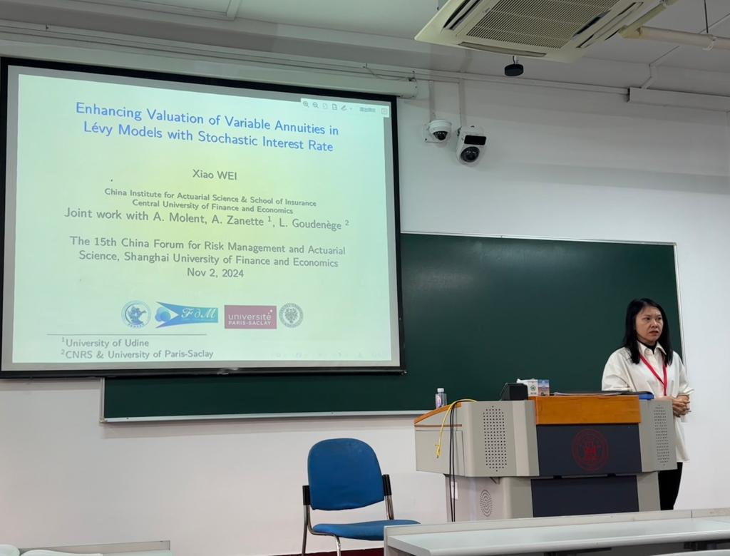 11月2日下午,韦晓副教授报告了题为“Enhancing Valuation of Variable Annuities in Lévy Models with Stochastic Interest Rate”的学术论文。她详细阐述了基于Hull-White随机利率和Lévy市场环境的带有最低保证和退保选项的变额年金定价研究。她的研究采用树方法与有限差分技术相结合的混合数值方法进行计算,并通过比较静态分析探讨了利率参数对最优退保保费的影响,强调了随机利率在变额年金定价中的重要性。
