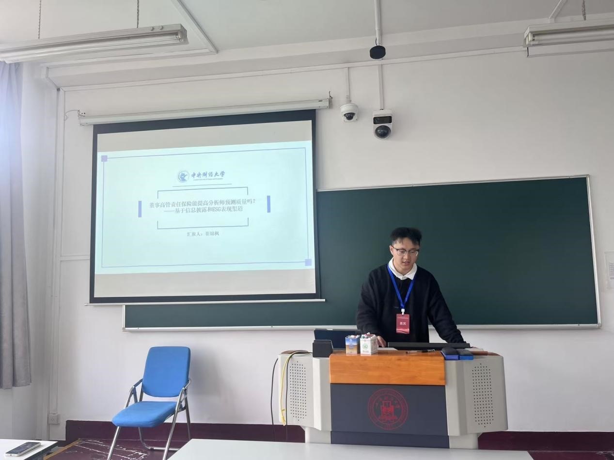 在2号下午的分会场报告中,崔锦枫同学在平行论坛10对论文“董事高管责任保险能提高分析师预测质量吗?——基于信息披露和ESG表现的视角”进行汇报。他认为高质量的分析师预测报告对打破投资者信息壁垒、提高资本市场运作效率至关重要。董事高管责任保险对上市公司信息披露质量和公司治理表现有显著影响,并且能提高分析师预测质量。
