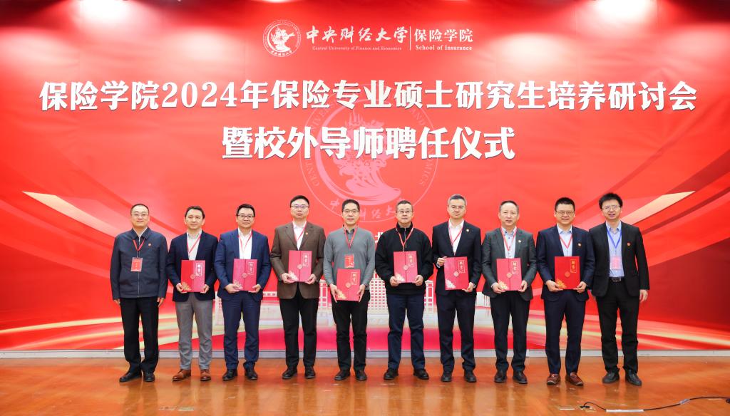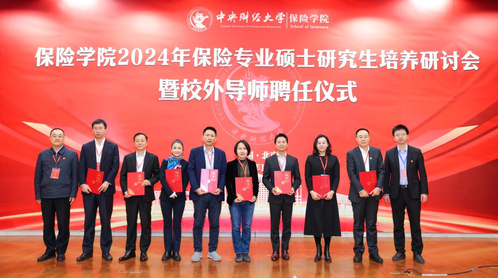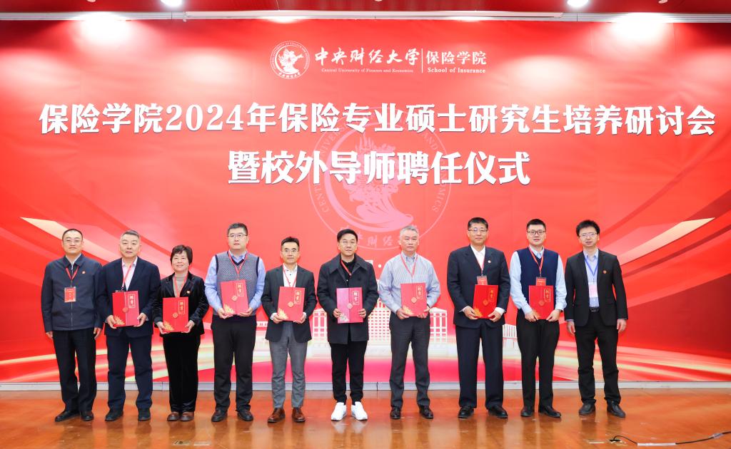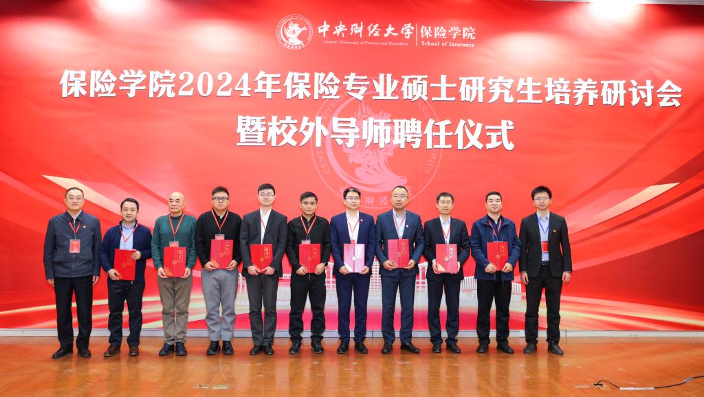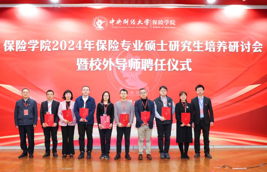 在聘任仪式上,周桦院长宣读了2024年保险专业学位硕士研究生校外导师名单。本次受聘的59位校外导师均为金融保险业相关企业、政府部门或事业单位的专家,具有丰富的金融、保险从业经验。李涛副校长为校外导师颁发聘书并合影。
