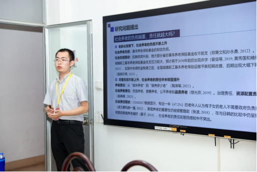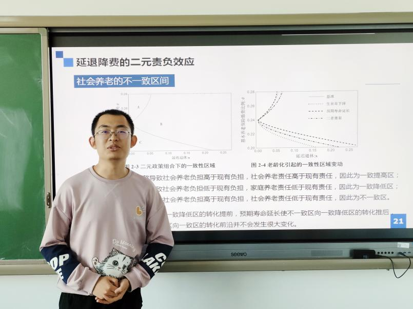 乔智博士报告了题为《老龄化背景下延退降费对社会养老责任负担影响研究》的学术论文。他通过构建世代交叠模型,研究城镇职工基本养老保险缴费率下降与延迟退休对社会养老责任与负担的影响。研究发现,社保降费有可能造成社会养老负担和责任不一致的变动,延迟退休达到一定年限后,社会养老会从责任负担不一致转向责任负担一致。个人账户与统筹账户的管理部门可能存在不同的延迟退休年限偏好。
