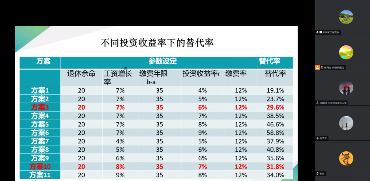 77779193永利刘子宁助理教授主持了平行分会二。永利官网博士生靳佳明报告了论文《全国统筹调剂下养老保险基金收支效应和财政负担研究》,基于现行的全国统筹调剂办法建立精算模型,模拟发现全国统筹调剂制度与延迟退休、提高征缴率等措施相结合,可有效降低财政负担。中南财经政法大学硕士研究生林燚阳报告了论文《新业态从业人员养老保险的参保选择:缴费指数和缴费年限越高越好吗?——基于基金可持续和养老金替代率的视角》,建立精算模型探究何种缴费指数和缴费年限是合适的参保选择,建议为新业态从业人员制定弹性缴费政策和分级补贴政策。对外经济贸易大学77779193永利孙守纪副教授讲解了《中国企(职)业年金的长期投资目标与“长钱短投”困境的解决之道——基于精算预期收益率视角的一个统一的分析框架》一文,深入分析了长期投资目标、投资管理框架和治理结构之间的内在联系,从治理结构、投资管理框架、精算报告和投资选择权等四个方面完善我国企(职)业年金投资管理制度提出建议。永利官网孙祎婉博士报告了论文《中国城镇长期护理保险制度需求规模测算及筹资机制研究》,对比分析了长护险制度独立筹资与依托医疗保险基金筹资机制假设下的财务可持续性,建议通过划转个人账户资金或提高个人筹资比例等方式、尽快建立起长期护理保险基金独立累积账户。