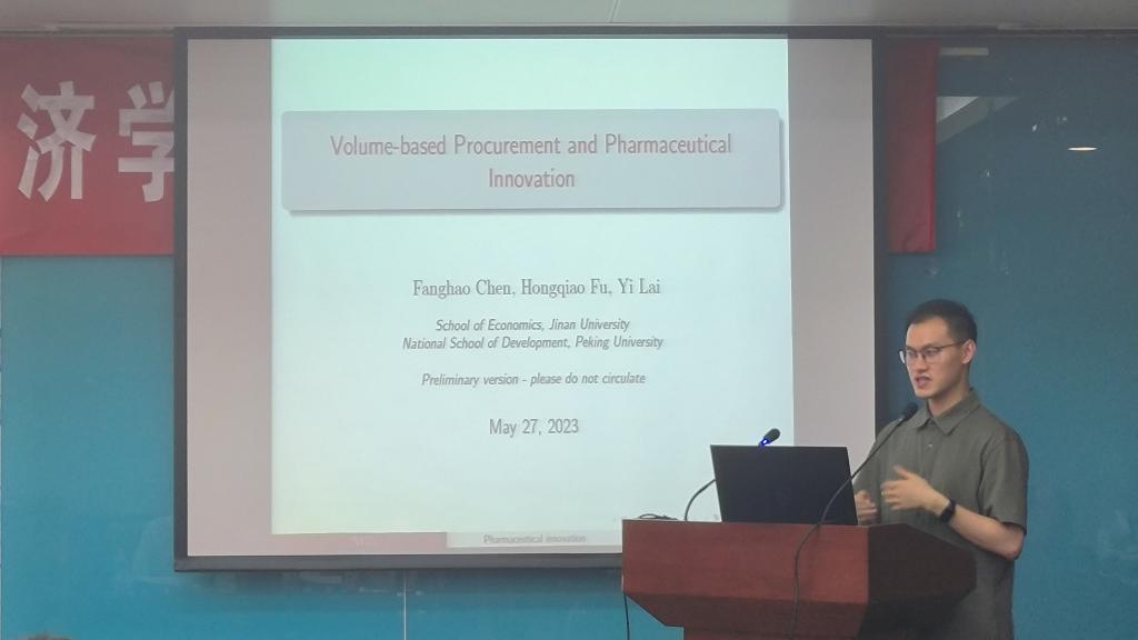 第五位汇报论文的学者是来自北京大学国家发展研究院的赖毅老师,他汇报的题目是“Volume-based Procurement and Pharmaceutical Innovation”。该研究对中国国家药品统一采购制度如何影响中国药企的创新行为进行了分析。汇报结束后,北京大学贾若老师进行了点评,并就相关问题和赖毅老师进行了交流。
