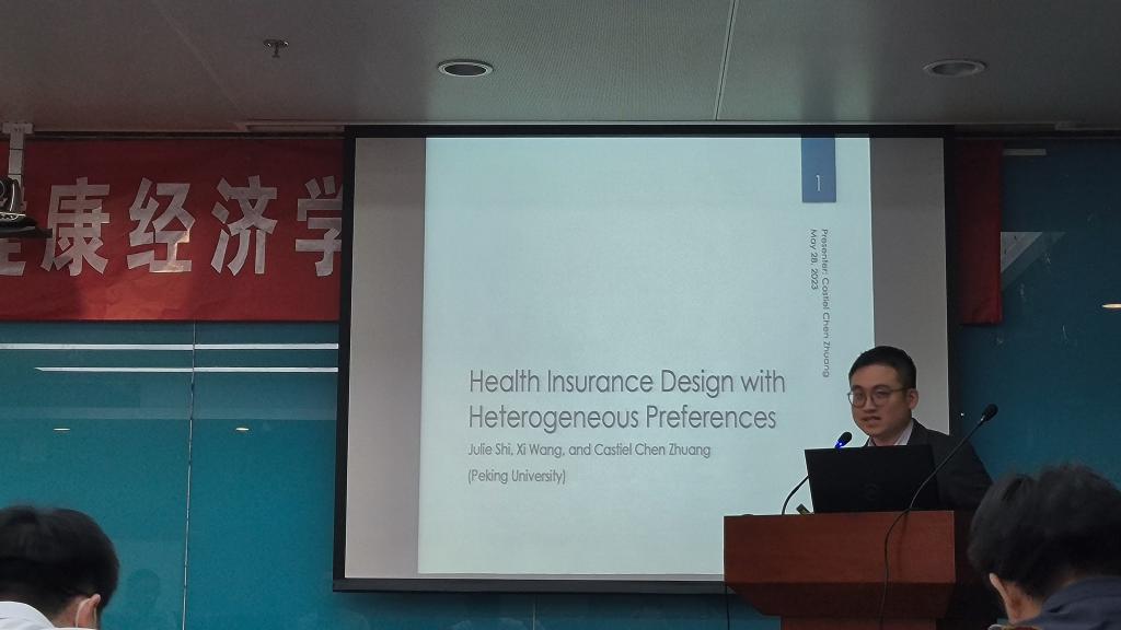 第四位汇报论文的学者是来自北京大学经济学院的庄晨老师,他汇报的题目是“Health Insurance Design with Heterogeneous Preferences”。该研究根据不同等级医院提供了一个基于价值的健康保险设计经验分析框架。汇报结束后,来自北京大学的赖毅老师进行了点评,并就相关问题和庄晨老师进行了交流。