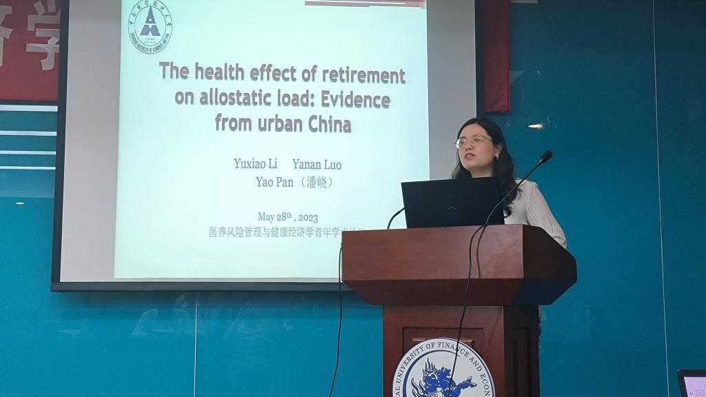 第一位汇报论文的学者是来自中南财经政法大学的潘峣老师,她汇报的题目是“The health effect of retirement on allostatic load: Evidence from urban China”。该研究从微观层面关注了退休对于老年人健康情况的影响。汇报结束后,来自永利官网的王吉元老师进行了点评,并就相关问题和潘峣老师进行了交流。