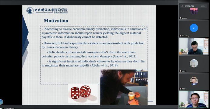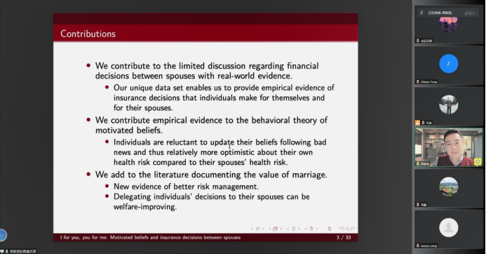 第四位汇报论文的学者是来自中国人民大学财政金融学院的郑家昆老师,他汇报的题目是“I for you, you for me: Motivated beliefs and insurance decisions between spouses”,该研究尝试用动机信念来解释个人给配偶购买健康保险的行为。汇报结束后,杨婉彧老师进行了点评并且就相关问题和郑家昆老师进行了交流。