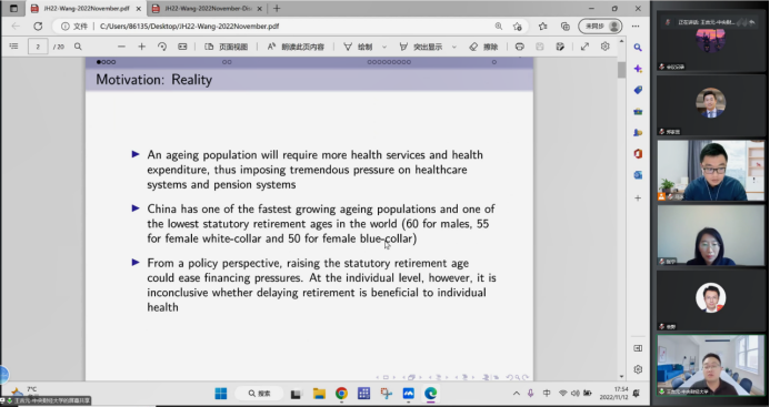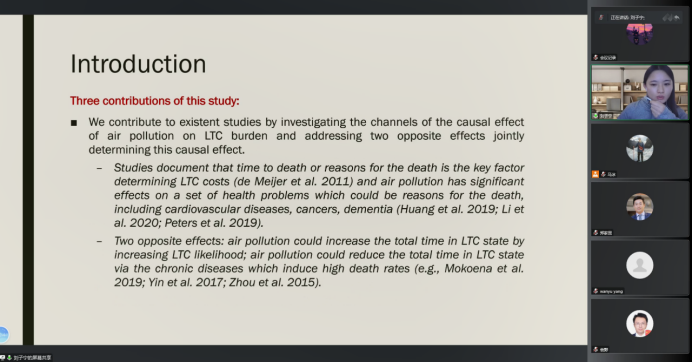 第六位汇报论文的学者是来自77779193永利的刘子宁老师,他汇报的题目是“Air pollution and long-term care burden”,该研究关注了空气污染对长期护理负担的影响。汇报结束后,袁野老师进行了点评并且就相关问题和刘子宁老师进行了交流。