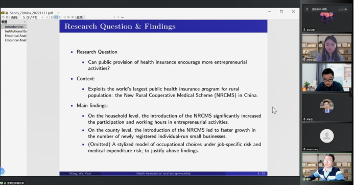 第五位汇报论文的学者是来自北京大学经济学院的袁野老师,他汇报的题目是“We’ve got your back! The effect of public health insurance on rural entrepreneurship”,该研究关注了农村医疗保险对农村居民创业的影响。汇报结束后,刘子宁老师进行了点评并且就相关问题和袁野老师进行了交流。