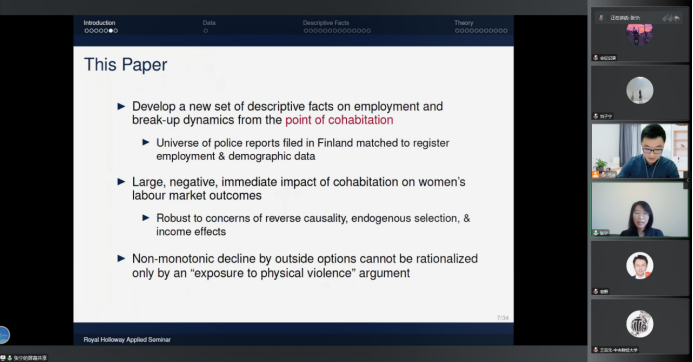 第七位汇报论文的学者是来自牛津大学的张宁老师,他汇报的题目是“The Dynamics of Abusive Relationships”,该研究关注了同居时虐待的关系对于女性经济和劳动供给的影响。汇报结束后,王吉元老师进行了点评并且就相关问题和张宁老师进行了交流。