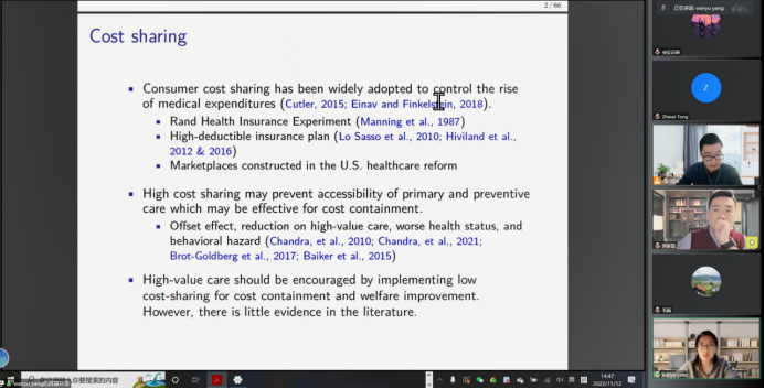 第三位汇报论文的学者是来自东北财经大学高等经济研究院的杨婉彧老师,他汇报的题目是“Pay more for less: effect of subsidizing primary care for chronic diseases”,该研究关注了慢性病补偿政策对医疗服务使用的影响。汇报结束后,郑家昆老师进行了点评并且就相关问题和杨婉彧老师进行了交流。