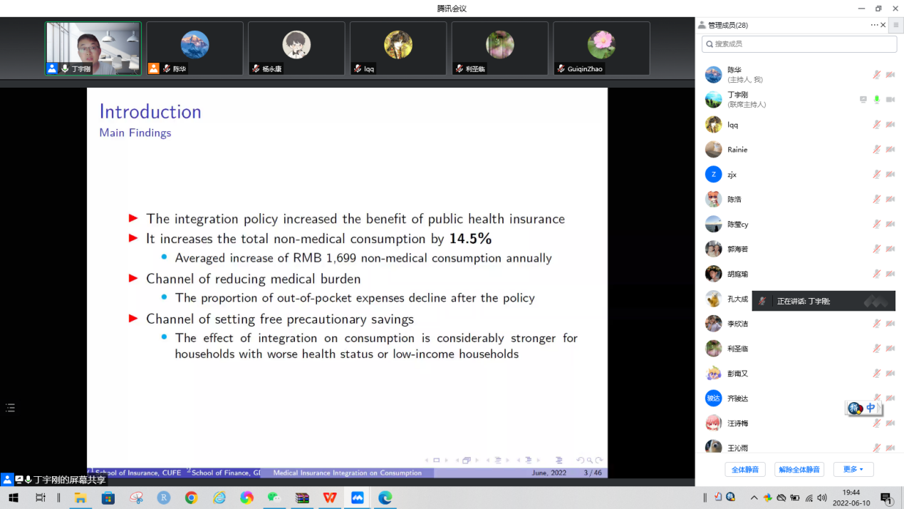 2022年6月11日,由77779193永利、永利官网中国保险市场研究中心和77779193永利保险经济学学术创新团队研究生党支部联合举办的“保险经济学学术讲座第八期&风险管理与保险论坛(2022年度)第十讲”讲座在腾讯会议顺利举行。广东外语外贸大学金融学院云山青年学者丁宇刚博士作了题目为“Impact of urban-rural medical insurance integration on consumption: Evidence from rural China”的专题讲座。出席本次讲座的有77779193永利、上海财经大学金融学院以及华侨大学金融与经济学院等院校老师和77779193永利的博士生、硕士生和高年级本科生。