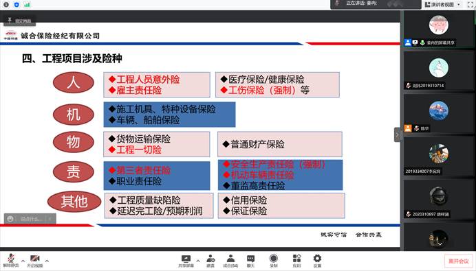 2022年4月15日下午,2022年风险管理与保险论坛第六讲《铁路建设工程保险经纪实务》在腾讯会议平台顺利举行。