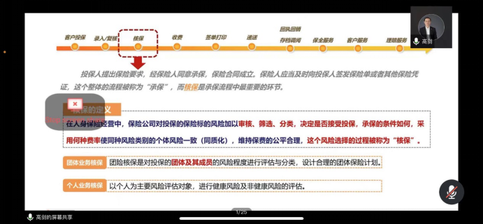 在介绍核保业务时,高剑先生结合实际案例与日常工作经验,向同学们分享了团体业务核保与个人业务核保的具体流程与业务细节。