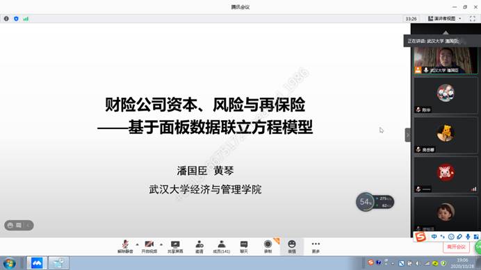 2020年10月28日,武汉大学经济管理学院潘国臣副教授应我院陈华副教授邀请,做客保险经济学第一期讲座,以“财险公司资本、风险与再保险——基于面板数据联立方程模型”为主题进行了一场线上讲座。讲座由我院陈华副教授主持,学院老师、博士生、硕士生、本科生以及北京工商大学关晶老师等其他院校师生近150人参加了讲座。