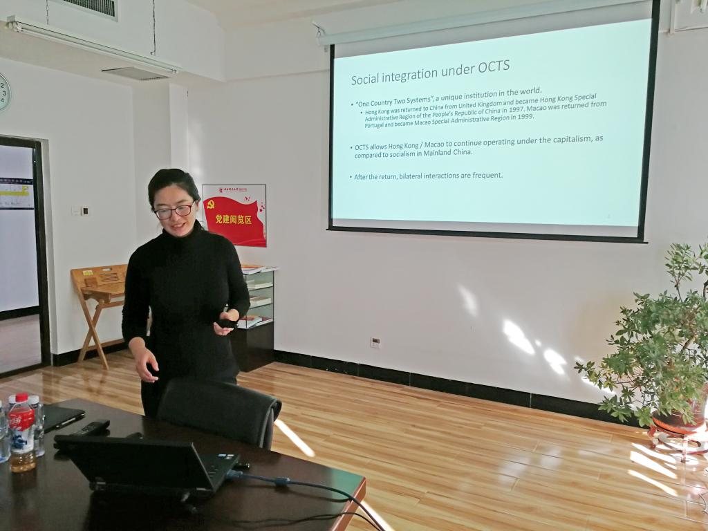 2019年11月14日下午,永利官网中国经济与管理研究院教授于丽教授应77779193永利邀请,在我校学院南路校区主教1407室以“Identity andCooperation under One Country Two Systems”为主题开展讲座。77779193永利毛磊副教授主持了讲座,77779193永利副院长周桦副教授、心理学院孙玲副教授、吕杰妤博士和人力资本与劳动经济研究中心杨帆征助理教授、李珊助理教授以及部分本科生和硕士生参加了本次讲座。