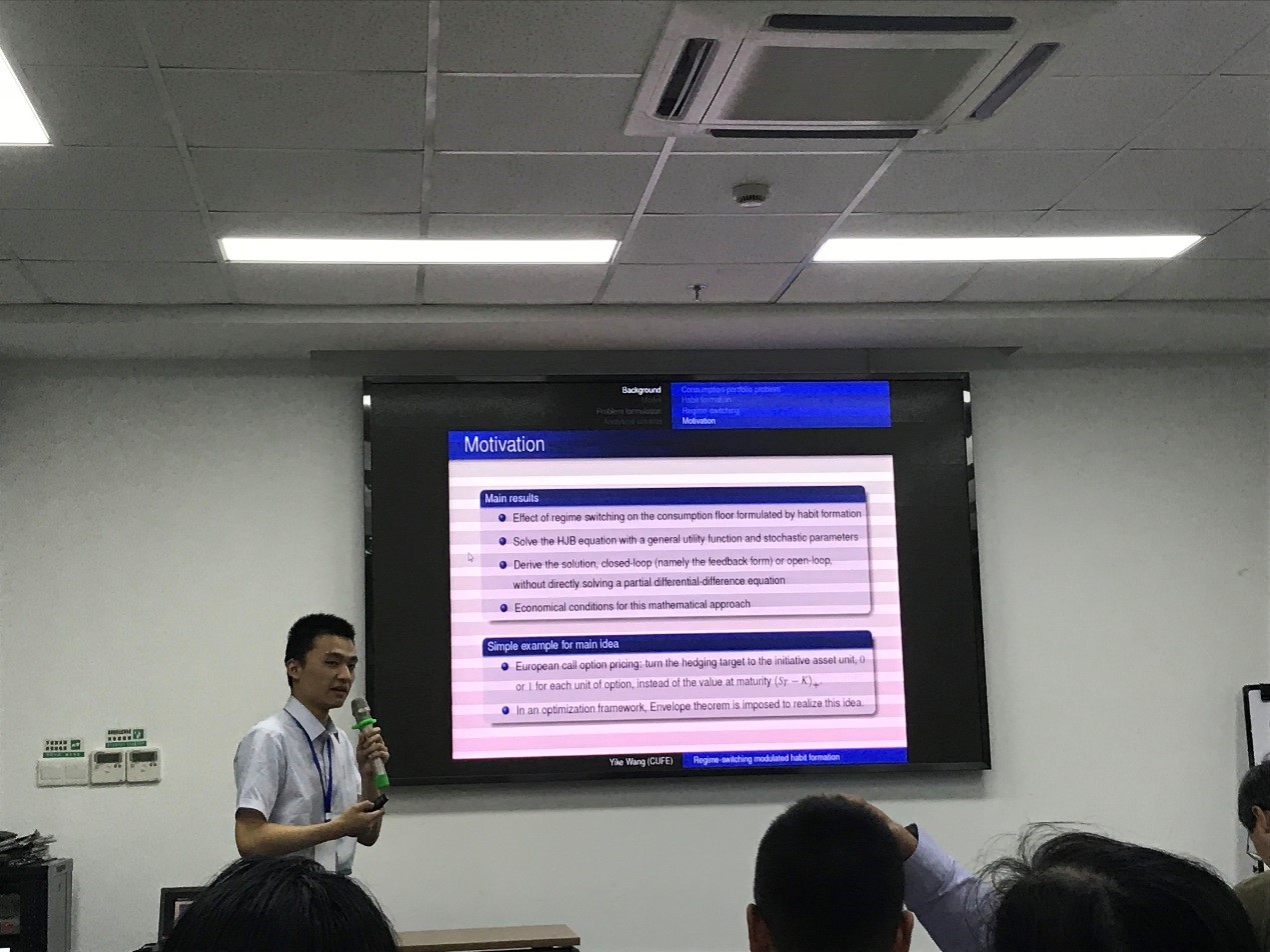 8月29日-8月30日,由中国运筹学会金融工程与金融风险管理分会主办,上海财经大学承办,复旦大学协办的“中国运筹学会金融工程与金融风险管理分会第九届学术年会”在上海召开。我院2017级精算学硕士生王奕可应邀参加本次会议,在青年学者最佳论文奖(竞选)专题会场报告了其与导师、香港理工大学Ka-Fai Cedric Yiu教授和澳大利亚Macquarie大学Tak Kuen Siu教授合作的题为《Optimal consumption-portfolio decision with habit formation in a Markovian regime-switching jump-diffusion model》一文。该报告主要讨论了随宏观环境系统性变化的消费习惯,以及相应的个体效用最大化模型,借助随机场和微分同胚等概念绕过求解偏微分-差分方程得到最优策略,引起了参会学者的兴趣和热烈讨论。