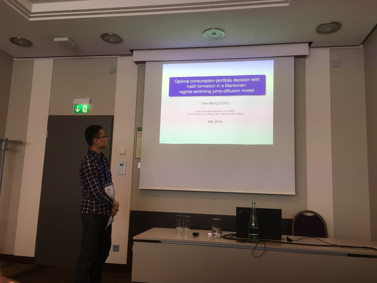 硕士生王奕可做题为“Optimal consumption-portfolio decision with habit formation in a Markovian regime-switching jump-diffusion model”分会场报告。他主要讨论了随宏观环境系统性变化的消费习惯,以及相应的个体效用最大化模型,给出了绕过偏微分-差分方程求解动态最优策略的方法,对该类带跳过程的优化问题求解具有启发意义。