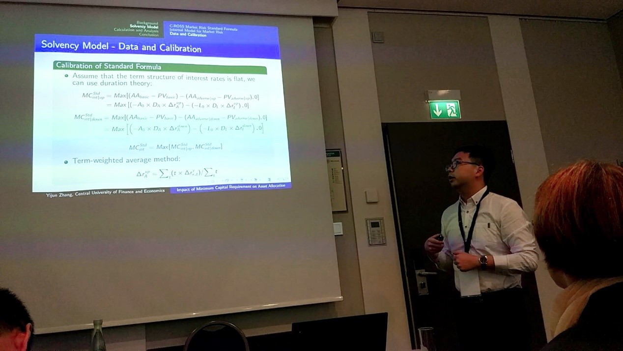 郑苏晋教授指导的硕士生张一骏做题为“Impact of Minimum Capital Requirement of Market Risk on Asset Allocation in Life Insurance Company under Internal Model and Standard Formula in China”分会场报告。他在马科维茨投资组合理论基础上,求解了寿险公司在“偿二代”下满足市场风险最低资本要求的资产配置,并分析标准法和内部模型法下的偿付能力情况。