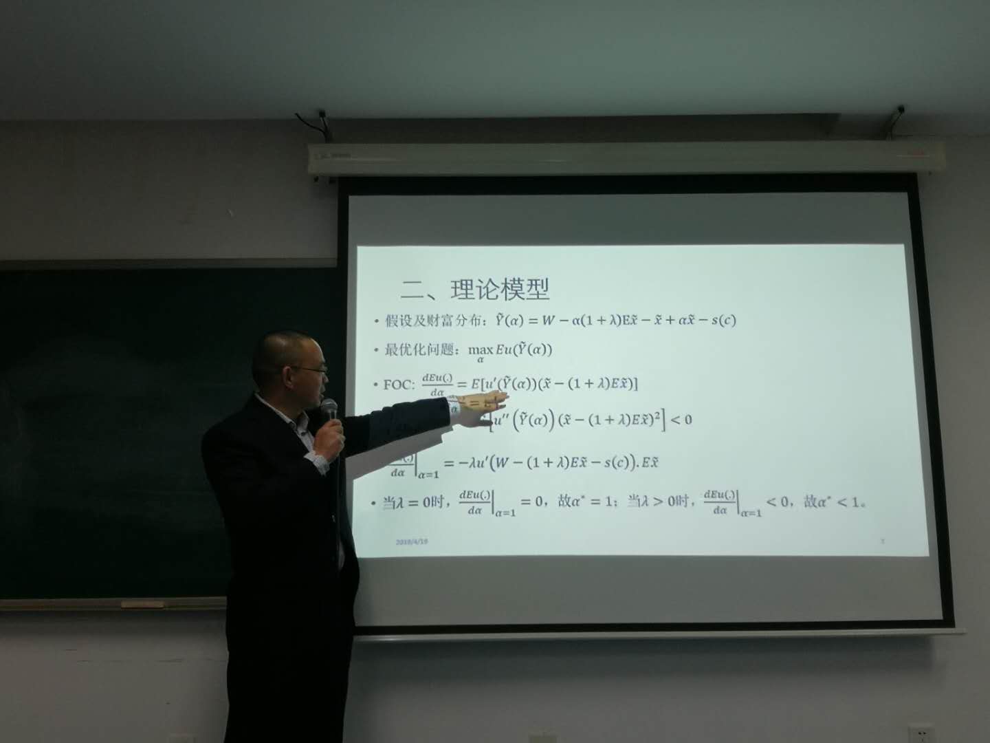 接下来王教授从微观数据研究家庭保险需求和实证两个方面介绍文献综述。并给出他的命题和理论模型:对于风险厌恶的投保人,如果效用函数是DARA的,则其保险购买水平随着认知能力的提高而提高;当认知能力低于某个临界值时,投保人不会购买保险。