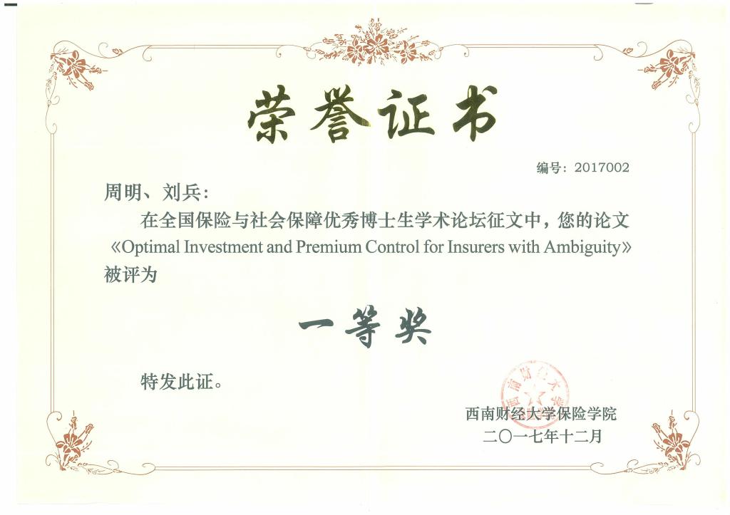 在12月2日举行的分会场讨论中,刘兵作了题为“Optimal Investment and Premium Control for Insurers with Ambiguity”的论文报告。此论文是在其导师周明研究员的指导下合作完成的。该论文研究的是保险公司结合自身保险业务进行金融市场投资时所面临的保费调整以及投资到风险资产上资金的最优比例问题。论文将保险公司的现金流模型和金融市场的风险价格模型的不确定性纳入到保险公司的现金流模型和金融市场风险资产的价格模型当中,得到了最优投资策略和最优的保费控制策略的解析解。论文的研究主题及观点论证引起了与会者的广泛关注与高度评价。经过严格评审,该论文获得了本次学术论坛一等奖。