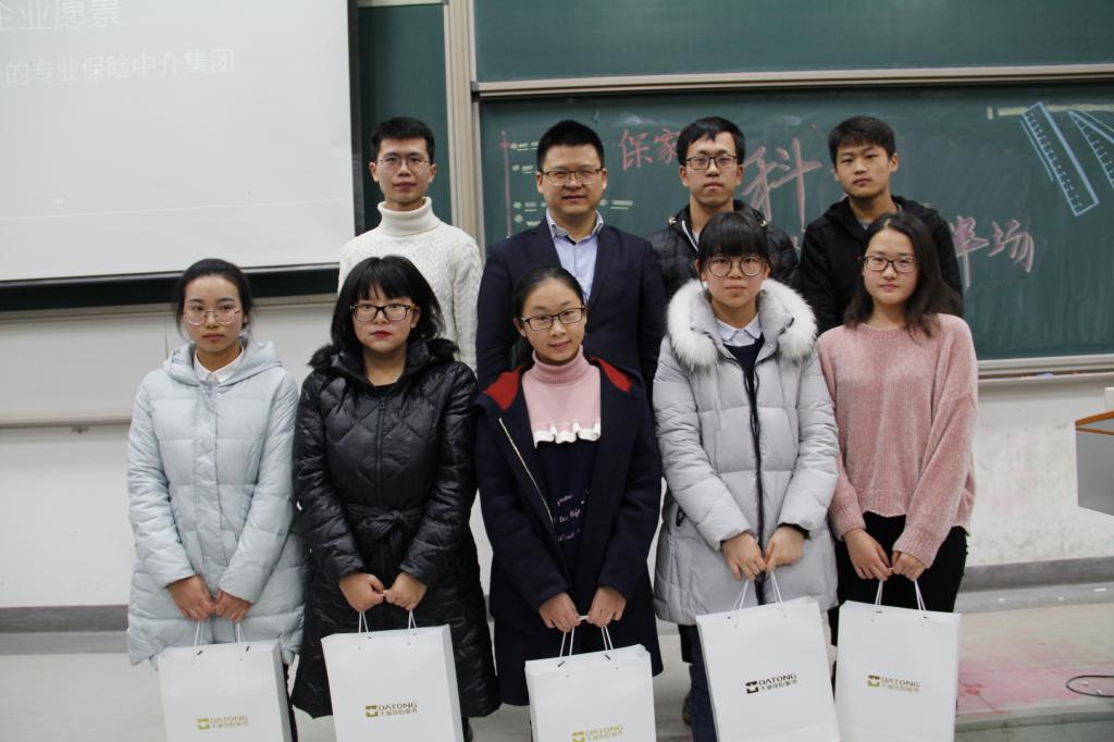 讲座最后,蒋铭先生为学生提出三点建议:第一,积极实践,适当接触社会,这样才能更好地理解并应用专业知识。第二,面对保险行业的“差评”,要正确看待,对保险行业充满信心,作为中财保险人更应该担负自己的责任。第三,在择业时,关注正处于发展期的公司,选择可以最大程度施展自己才华的岗位。蒋铭先生对学生的殷切期望极大鼓舞了在场学生。蒋铭先生还抽取了10位现场幸运观众并发放了大童保险销售服务有限公司纪念品。