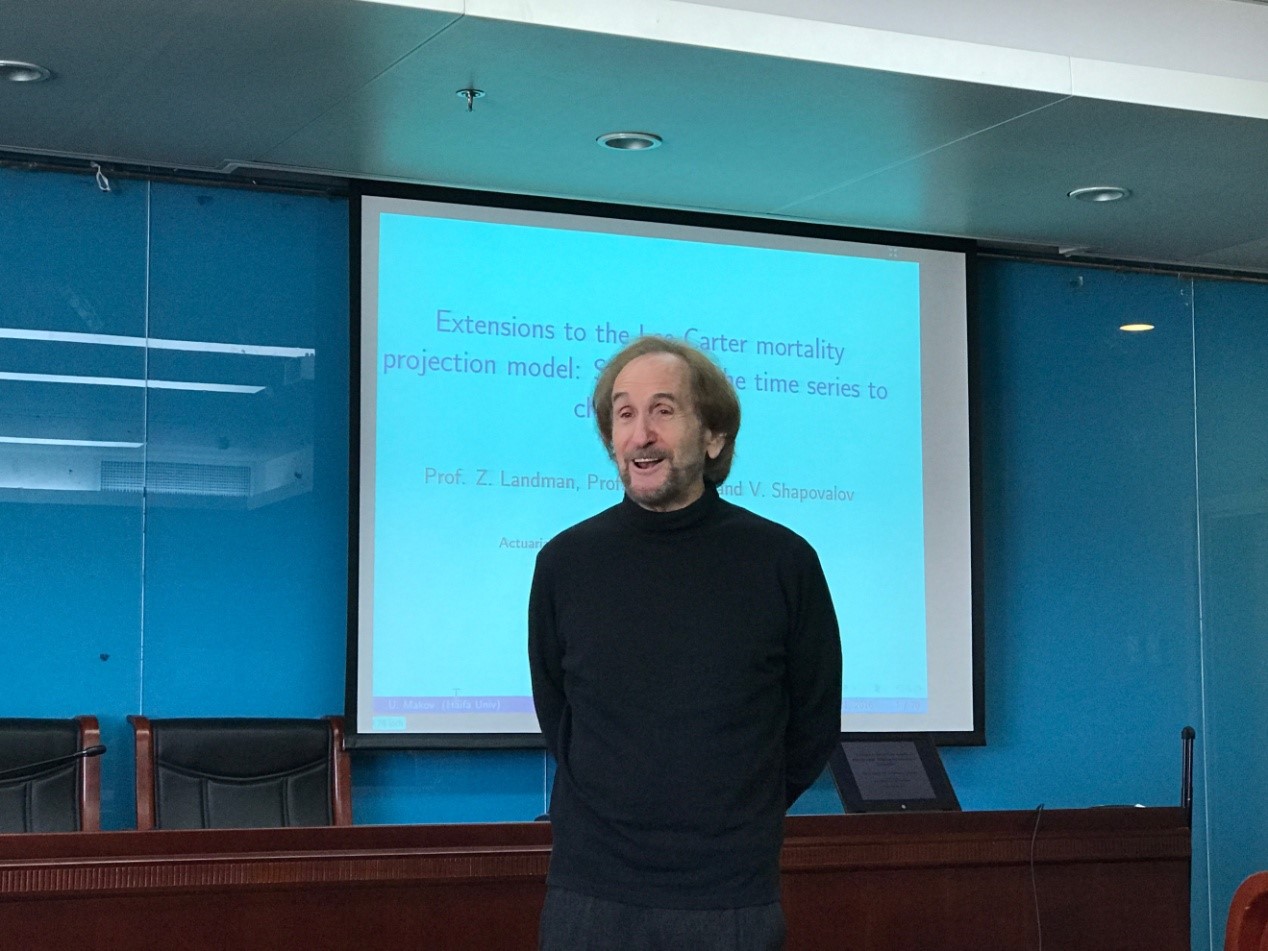 受永利官网引智项目(教育部学校特色项目《巨灾风险管理与再保险课程体系建设聘请外教特色项目》)支持,以色列海法大学Udi Makov教授于2016年12月11日至12月24日访问了我院,并于12月22日上午举办了一次关于长寿风险的高水平讲座。