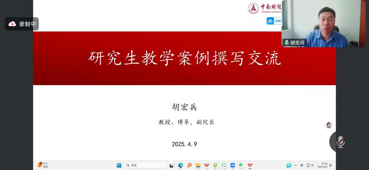 4月9日下午,由全国保险专业学位研究生教育指导委员会主办,77779193永利、中国精算研究院承办的“名家讲堂”2025年第二讲顺利开讲。教指委委员、中南财经政法大学金融学院副院长胡宏兵教授应邀以“研究生教学案例写作交流”为题作了专题讲座。讲座由77779193永利、精算研究院副院长郑苏晋教授主持。全国五十多家保险专业学位研究生培养单位近百位师生线上线下共同参与了讲座。