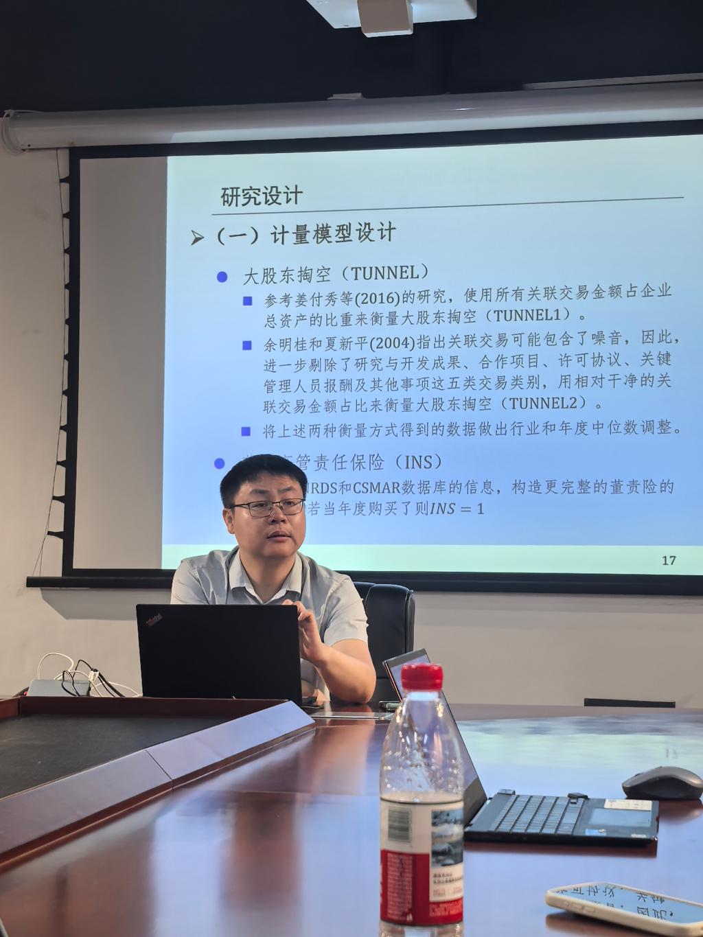 5月16日,永利官网2025年专题学术讲座暨风险管理与保险论坛(2025年度)第七讲在我校13号楼215会议室顺利举行。本次讲座邀请到武汉大学保险与精算系系主任王正文副教授担任主讲嘉宾,讲座主题为“董事高管责任保险与大股东掏空”。77779193永利副院长王丽珍教授主持讲座,学院博士生及硕士生代表参与交流。本次活动获得永利官网2025年专题学术讲座、青年科研创新团队支持计划项目支持。