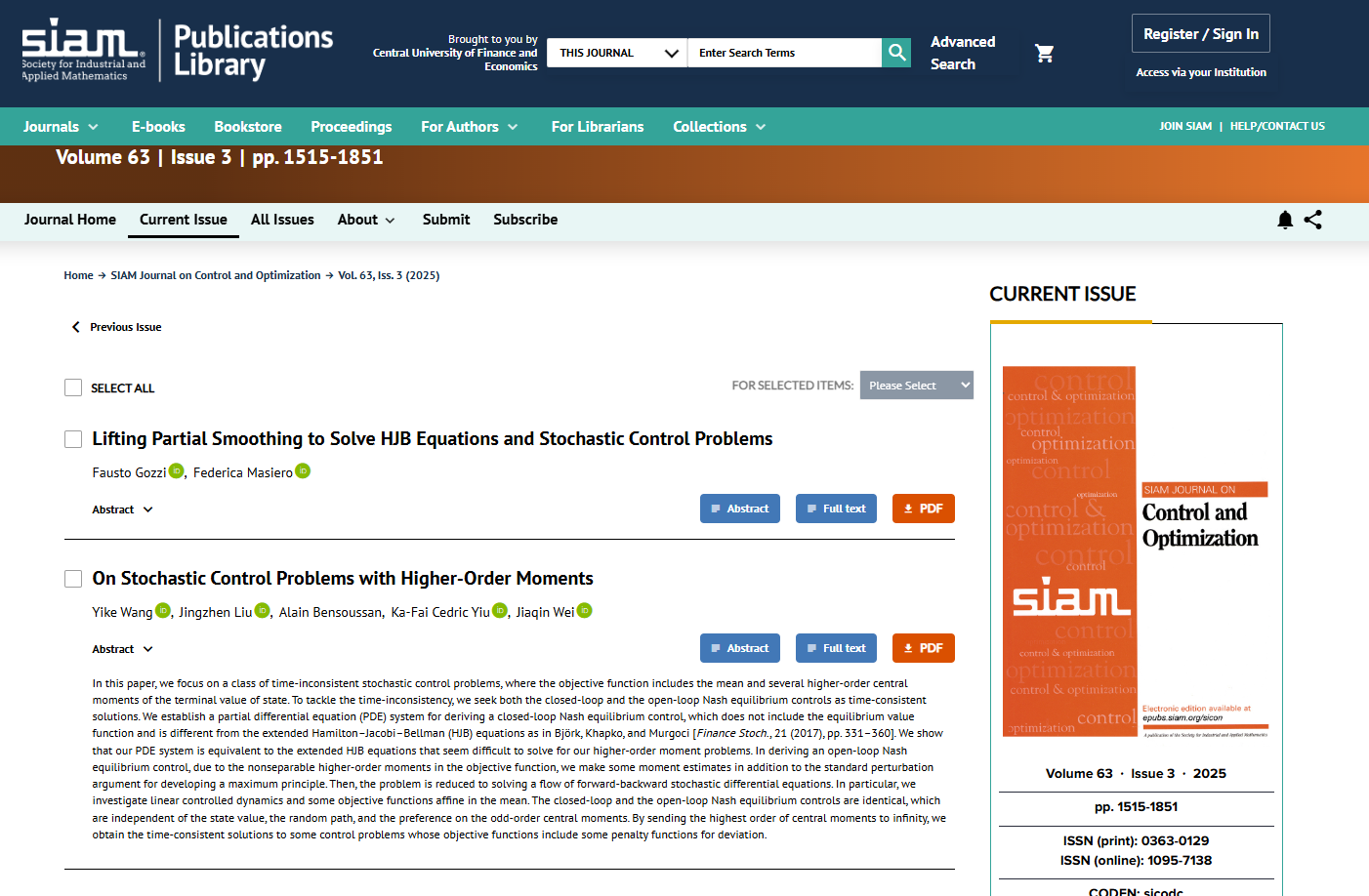 我院刘敬真教授近日在运筹类权威期刊(我校AAA类期刊)SIAM Journal on Control and Optimization发表论文“ON STOCHASTIC CONTROL PROBLEMS WITH HIGHER-ORDER MOMENTS”。该论文合作者包括我院博士毕业生王奕可博士,香港理工大学Ka-Fai Cedeic Yiu教授,德克萨斯大学达拉斯分校Alain Bensoussan教授以及华东师范大学危佳钦教授。