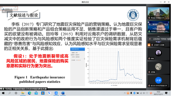 中国人民大学统计学院孟生旺教授作了题为《中国地震风险管理的精算模型与应用》的报告。报告基于中国实际地震损失数据,设计地震指数保险和地震巨灾债券,分析了它们在我国的适用性,并探讨了相关的定价模型和方法。报告研究指出,可通过应用多任务学习和数据分箱技术降低基差风险;可通过扩展扭曲函数,结合金融市场风险、地震损失风险及保险公司效用函数假设,确定巨灾债券设计中的赔付比例。