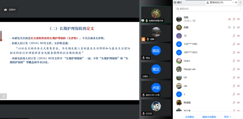 报告后,陈教授与参会的老师就微观仿真中的假设合理性和扩展性做了深入地探讨,并对长护险在财务收入方面的合理性和公平性问题进行了深入地交流。陈教授的报告从长护险制度的建设及完善等多角度给了我们很多启发,通过深入交流也加深了我们之间的联系,为日后进一步地合作打下良好基础。