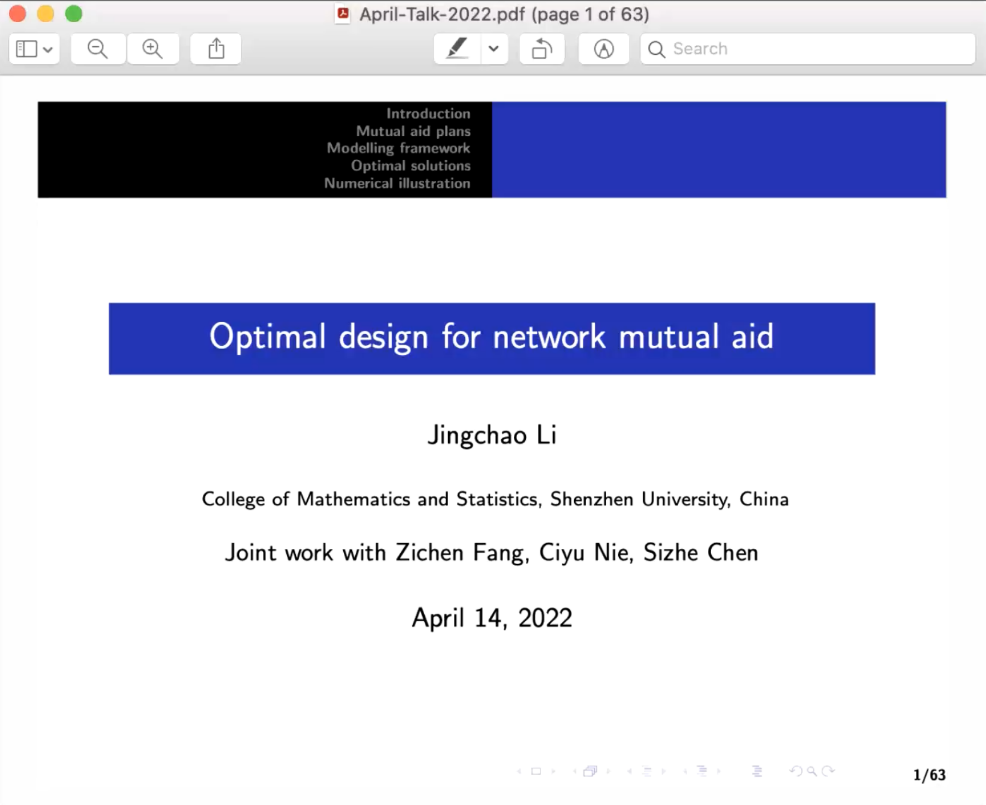 李婧超博士报告了题目为《Optimal design for network mutual aid》的研究成果。该报告主要展示了基于网络互助背景的参与者最优决策问题。虽然网络互助已经成为我国热门的风险分摊手段,但是目前存在的网络互助平台的分摊方式和定价原则都不满足精算原则。因此,她提出了多种互助模型,并且分别利用期望效用最大化和风险最小化原则构建了参与者的最优决策模型,以期帮助不同风险类型的会员能够以透明和精算公平的方式分摊风险。最后,通过将构建的模型与现实中的同类计划进行比较来显示她们研究模型的优越性。报告结束后,不少师生对李老师的研究进行积极提问,交流热烈。