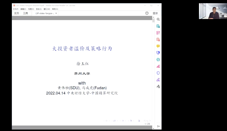 徐玉红老师报告题目为《大投资者溢价及策略行为》,他介绍了最近完成的一项工作。他建立了一个期望—方差模型来研究大的投资者对公司业绩造成影响的同时,各种类型投资者交易行为的博弈。他发现,对于一只质地良好的股票,相对于小的投资者,大股东可能会投入更高比例的财富,即使他们所获得的股权回报相同。而那些聪明的小投资者表现的行为更像“搭便车”,以至于他们会获得最高的确定性等价回报。独资公司的表现优于分散所有制公司。徐老师的研究成果引起了与会者的广泛关注和热烈讨论。