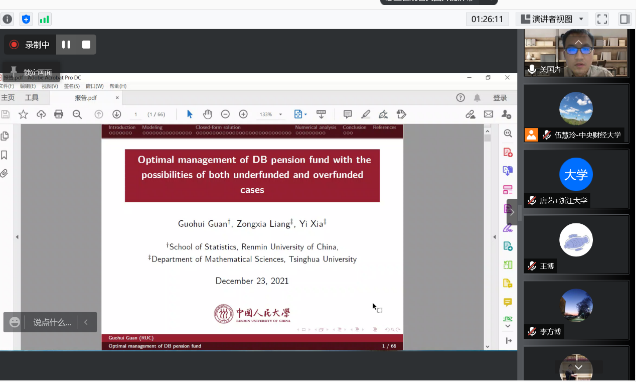 2021年12月23日下午2-4点,来自中国人民大学财政金融学院的何林教授和中国人民大学统计学院的关国卉副教授为我院师生做了主题为养老风险管理的主题报告。