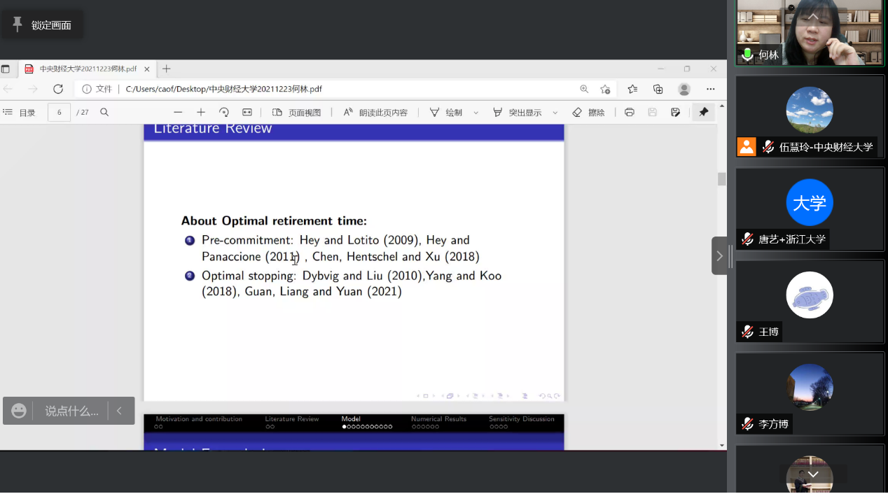 在第二场报告里,关国卉副教授研究了带有overfunded和underfunded同时存在的确定收益型养老计划的最优投资问题,很好地克服了传统模型里只存在单一情况的缺陷。作者们利用鞅方法,通过复杂的运算处理,得到了两种情形并存下的最优投资策略。通过数值算例,为大家讲解了不同参数对有效前沿,财富水平等指标的影响。
