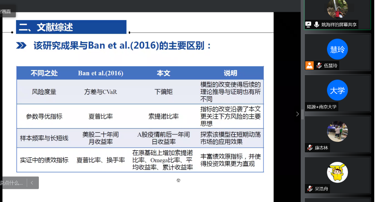 在第二场报告里,姚海祥教授将PBR约束条件推广到更一般化的均值-下偏矩模型中,证明了含PBR约束条件的均值-下偏矩模型的凸性,改造了标准的k-折交叉检验法,并用机器学习的方法,通过线性回溯法实时更新PBR约束条件的最优参数取值。最后,我们利用新冠疫情背景下的中国股票市场真实数据,对该模型进行了实证分析。
